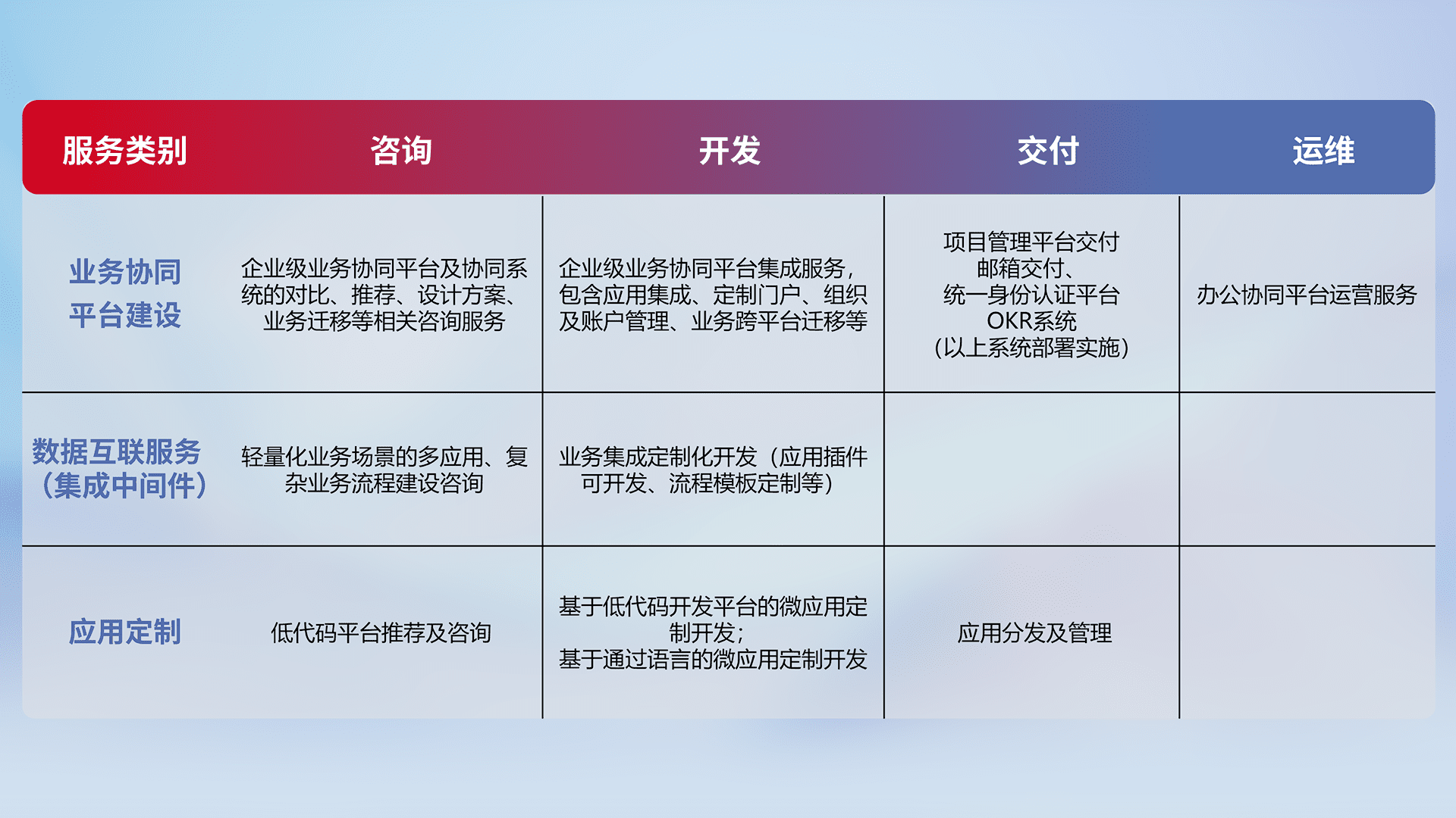 针对钉钉、、、、企微、、、IDaas等平台级产品提供产品的规划、、、方案、、、交付、、、、定制化开发等服务,,实现如统一协同办公、、、、智能客户服务、、、、混合会议管理、、、、智能数据查询、、等业务场景,,,,实现数字化转型。。。