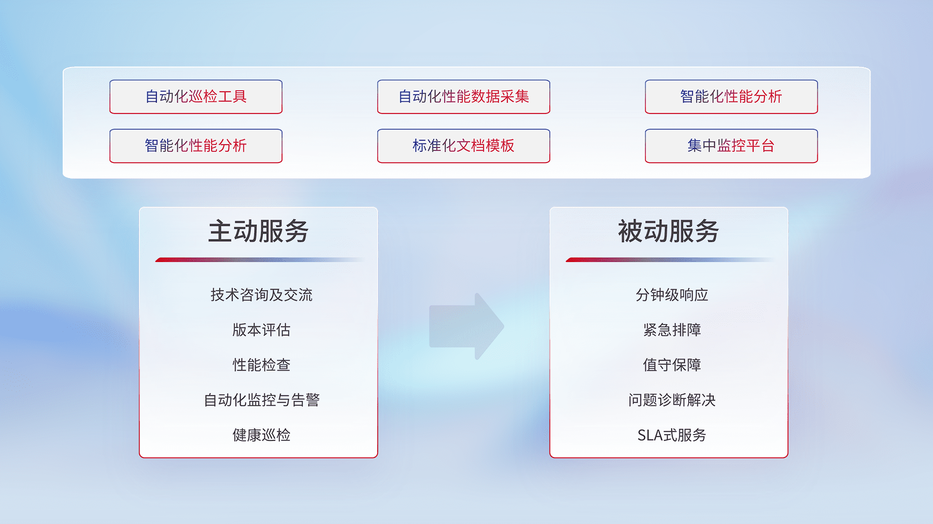 智能化工具和标准化文档,,保障服务质量,,,提供主动服务(包含技术咨询、、、、版本评估、、性能检查、、、、自动化监控与告警、、健康巡检)和被动服务包含(分钟级响应、、紧急排障、、、值守保障、、问题诊断解决、、SLA服务)。。